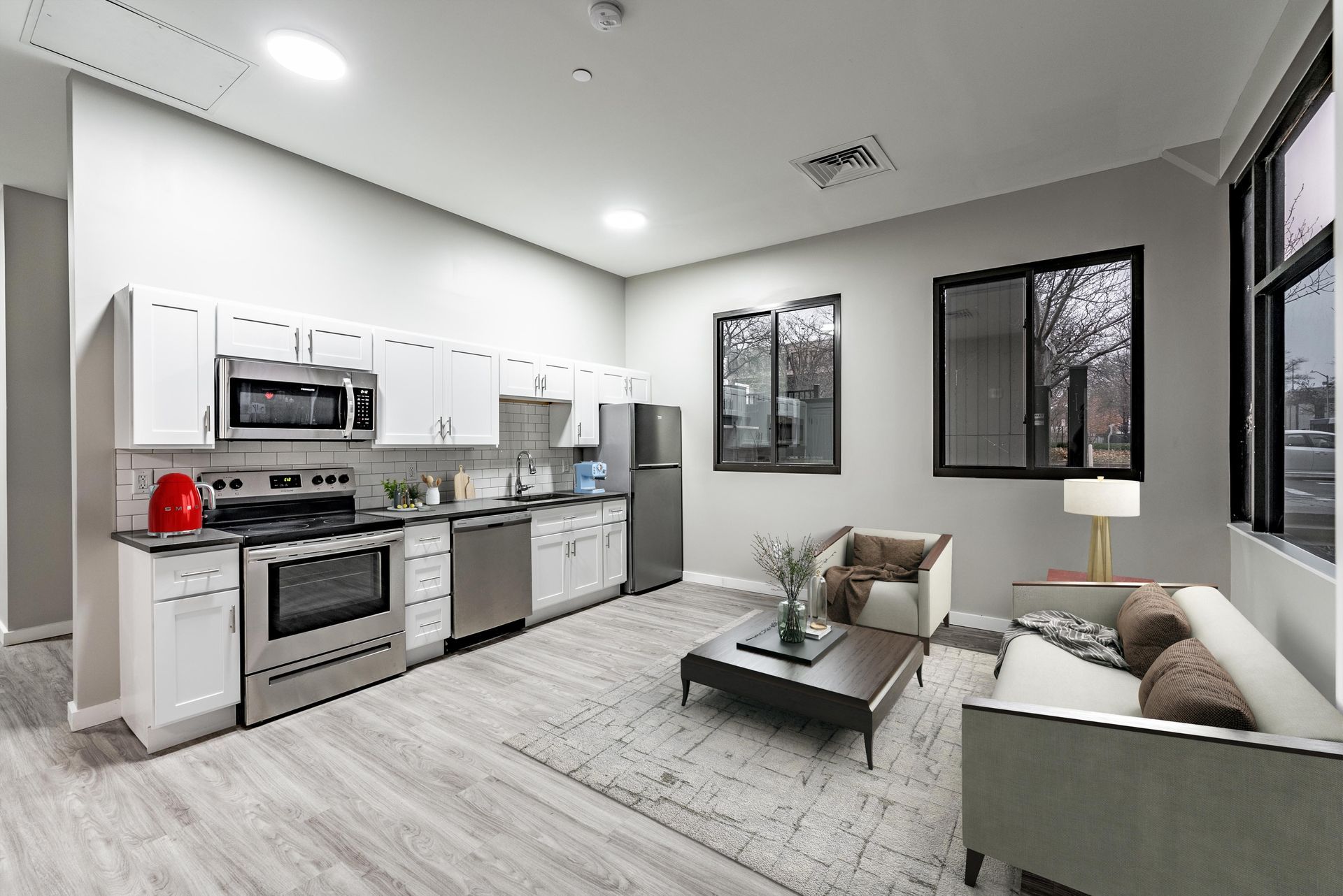 - Fully equipped kitchens with GE appliances